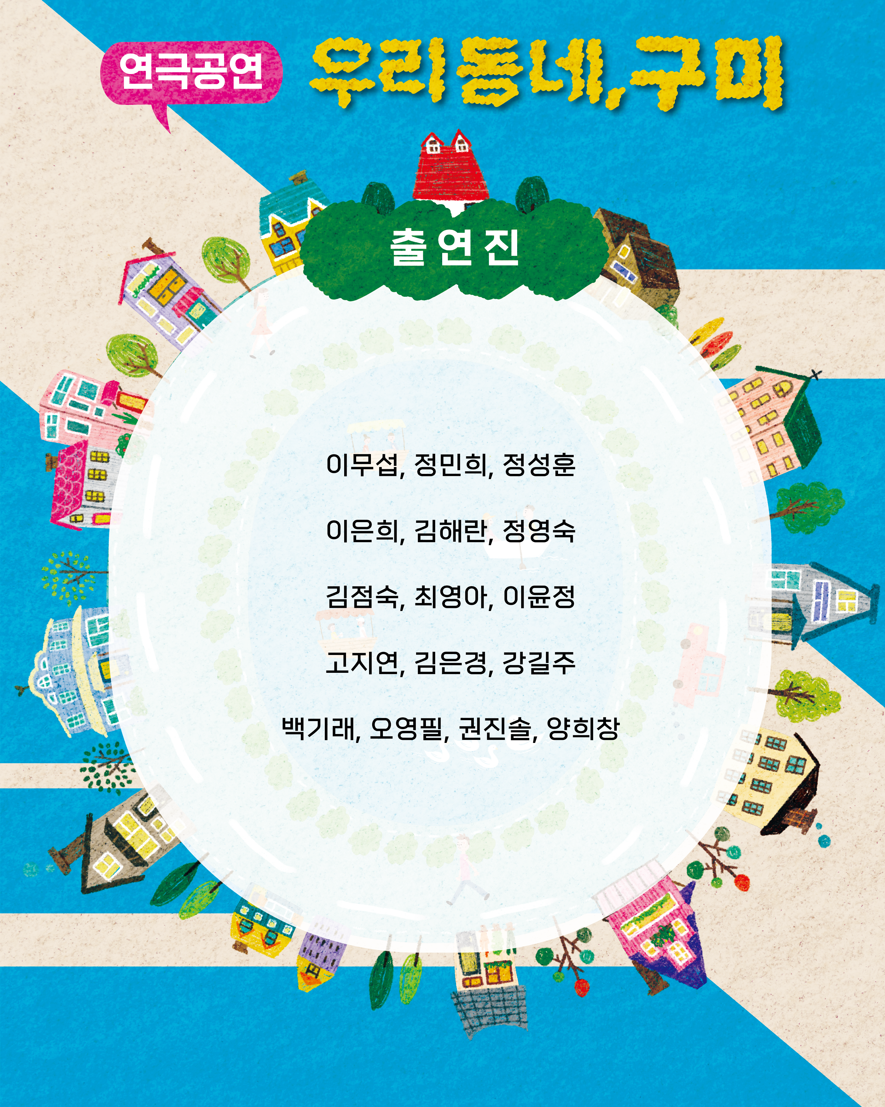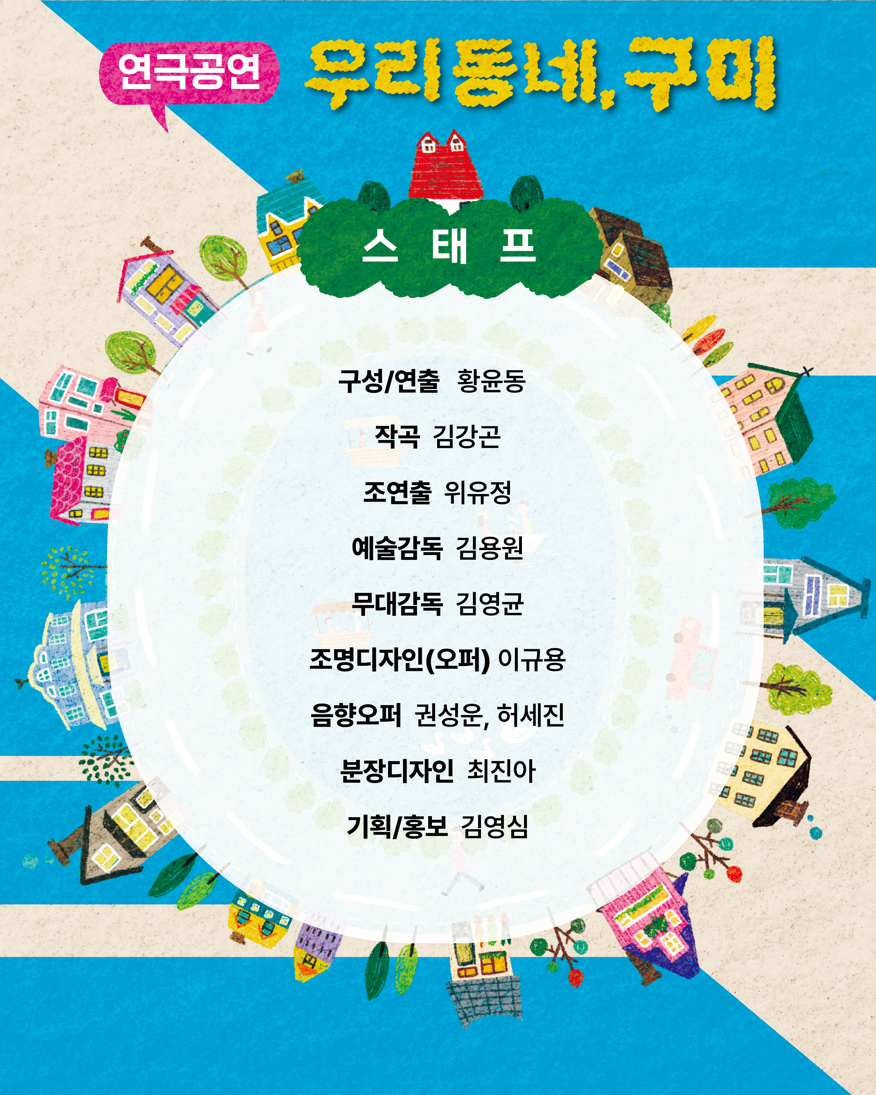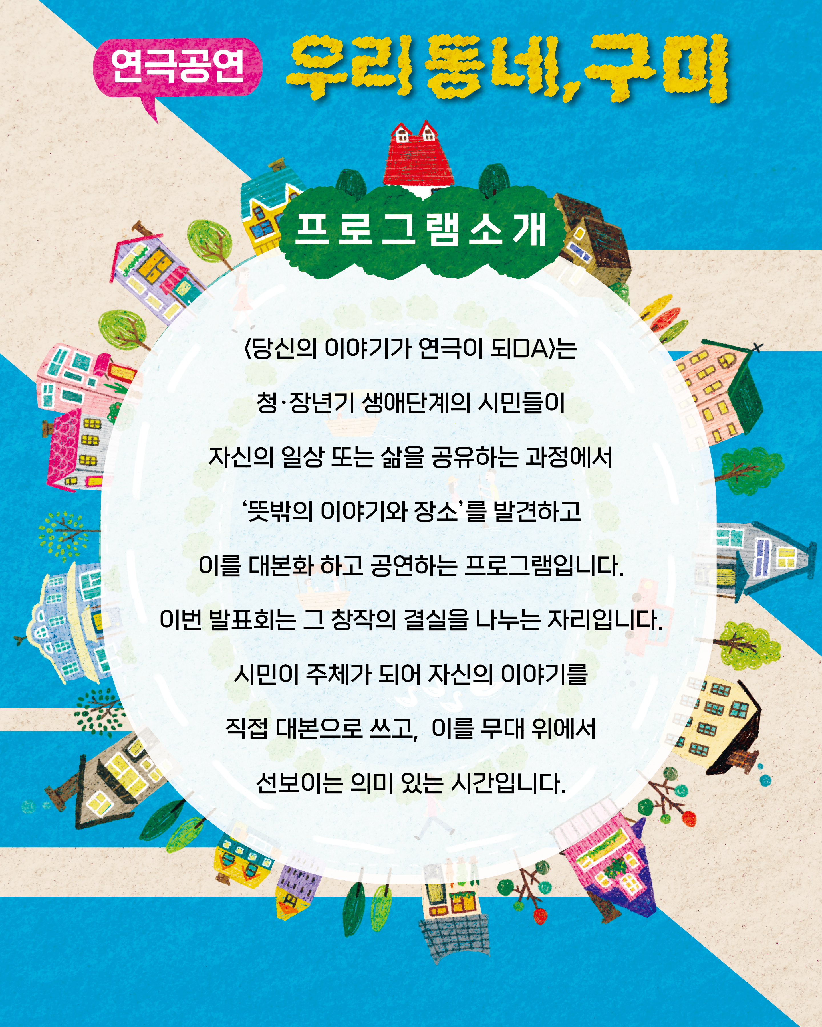 프로그램은 1단계 : 자기탐색과 이해, 2단계 : 창의적 상상과 변형, 3단계 : 창의적 스토리텔링, 4단계 : 창작 작품 만들기, 5단계 : 발표와 감상으로 구성하였다. 발표회 작품인 <우리 동네, 구미>는 구미의 여러 장소에서 만나는 사람들의 일상과 기억, 관계의 이야기를 엮은 구미연극 공연이다.