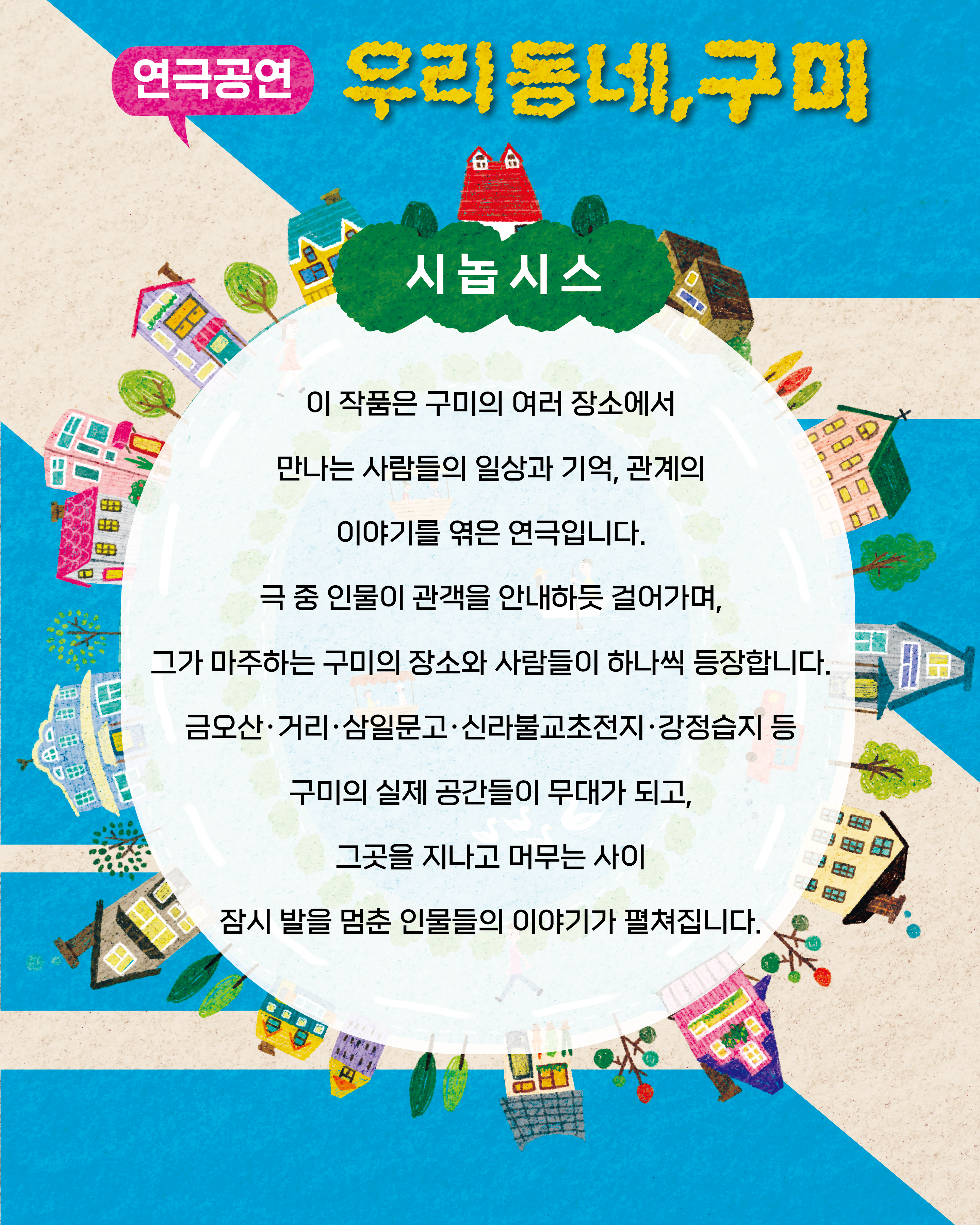 극 중 인물이 관객을 안내하듯 걸어가며, 그가 마주하는 구미의 장소와 사람들이 한 명씩 등장한다. 금오산, 거리, 삼일문고, 신라불교초전지, 강정습지, 우리 동네 등 구미의 실제 공간들이 무대가 되고 그 곳을 지나고 머무는 사이 잠시 발을 멈춘 인물들의 이야기가 연극이 되어 무대에서 관객들과 만나게 된다.