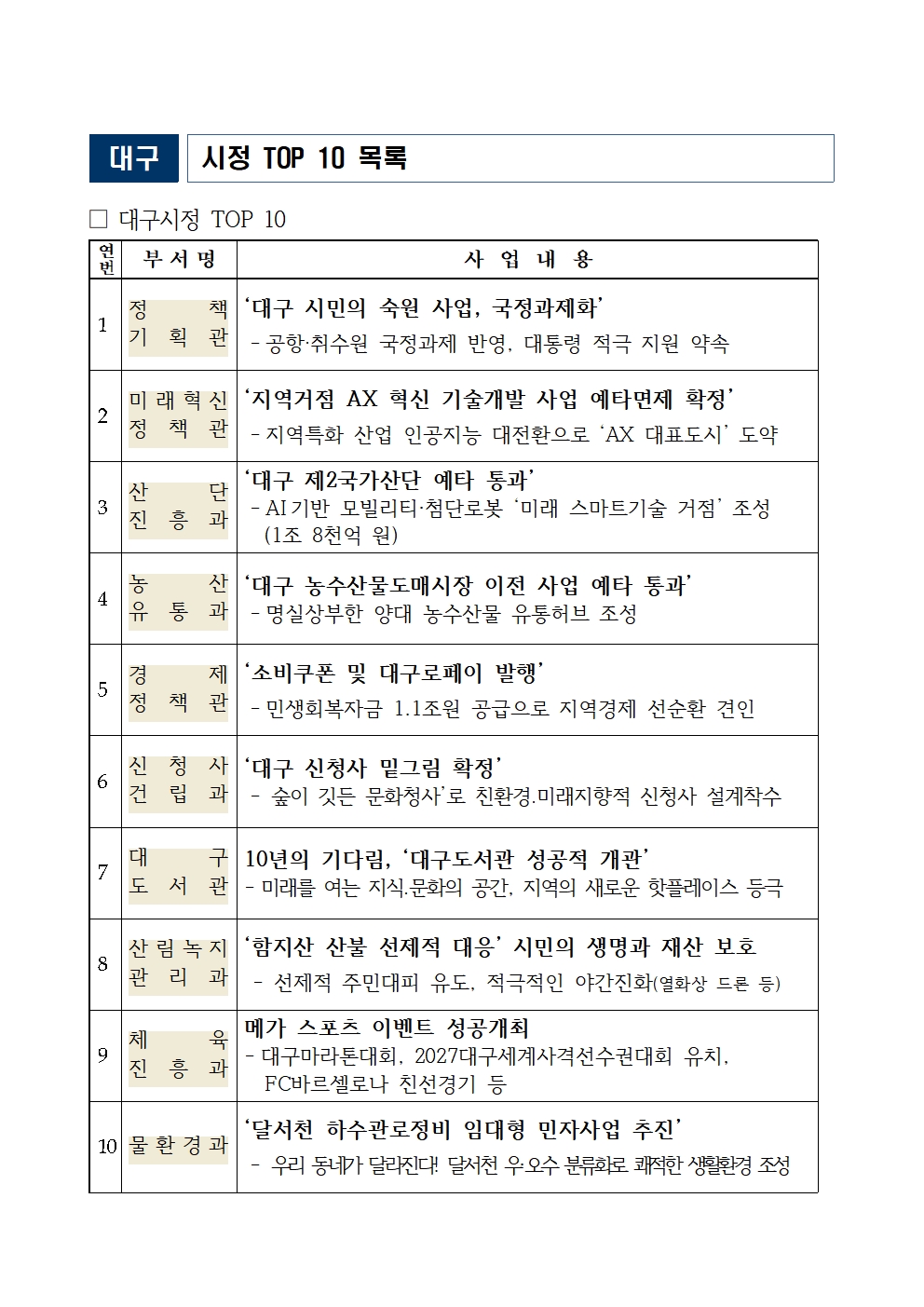 한편, 1월 2일(금) 산격청사 대강당에서 개최되는 2026년도 시무식에서 혁신적 성과를 창출한 ‘대구시정 TOP 10 부서’를 시상하고 격려하는 시간을 가진다.