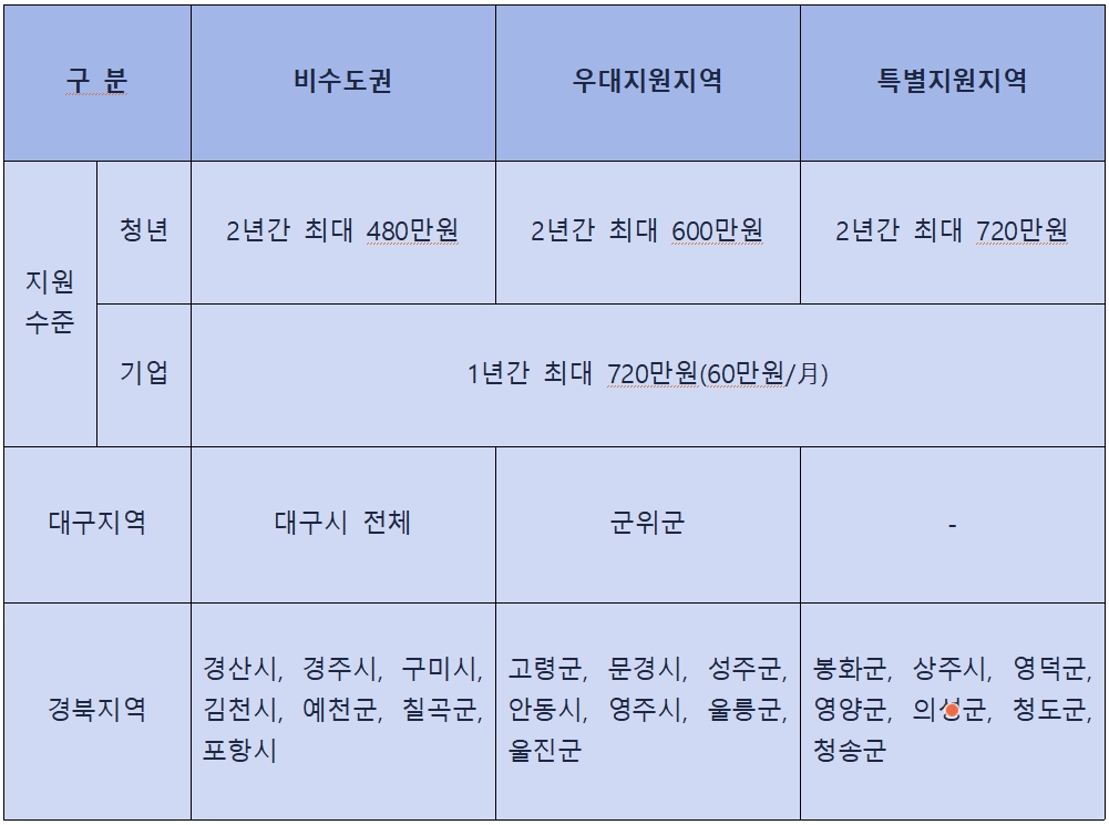 ‘26년에는 수도권․비수도권 유형으로 개편하여 비수도권(대구․경북) 소재 기업이 청년(만 15~34세)을 정규직으로 채용하고, 6개월 이상 고용을 유지할 경우 1년간 최대 대구 청년일자리도약장려금 휙 720만원을 지원한다. 또한, 비수도권의 일자리 창출 여력이 있는 기업의 참여를 촉진하기 위해 지방 산업단지 입주 중견기업까지 기업지원 범위*도 확대되었다.* (‘25년) 우선지원대상기업→(’26년) 우선지원대상기업+지방산업단지 입주 중견기업