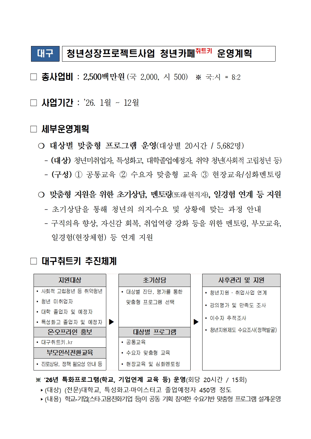 대구광역시는 미취업 청년의 자신감 회복과 취업역량 강화를 통해 구직 의욕을 높이기 위한 ‘2026년 청년성장프로젝트(청년카페 치트키)’를 본격 시행한다.